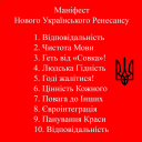- 10. Усі митці, що долучаються до течії Нового Українського Ренесансу вільні від сліпого виконання кожного пункту цього Маніфесту, але натомість приймають на себе відповідальність за ті ідеї, що відважуються нести в маси і зобов'язуються думати про те, чи відповідає їхній новий витвір образу Світлого Майбутнього України, в якому всі ми хочемо жити!